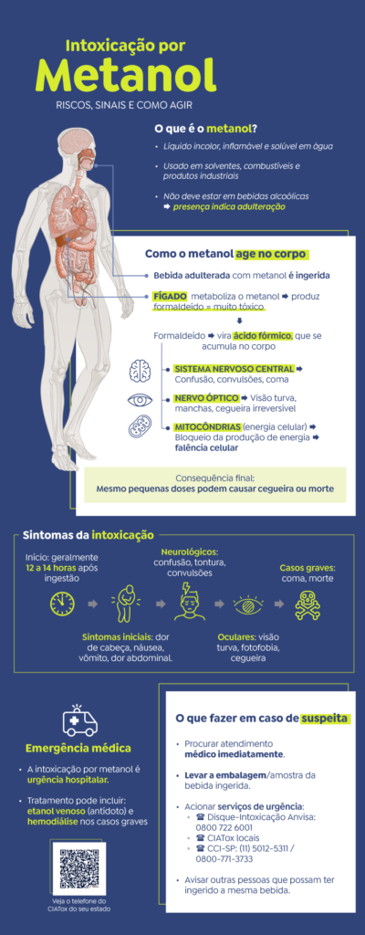 O metanol é rapidamente absorvido. Os primeiros sintomas podem ser sentidos em duas até 48 horas — a depender do quanto da substância foi ingerido. Uma vez absorvido pelo trato digestivo, ele passa pelo fígado e se transforma em dois metabólitos tóxicos, que entram na circulação. Eles chegam rapidamente ao sistema nervoso, e as células mais vulneráveis são os neurônios. Por isso, os primeiros sintomas são dor de cabeça intensa, alterações no nervo óptico, visão turva ou borrada, podendo evoluir para redução da acuidade visual e, nos casos mais graves, cegueira.