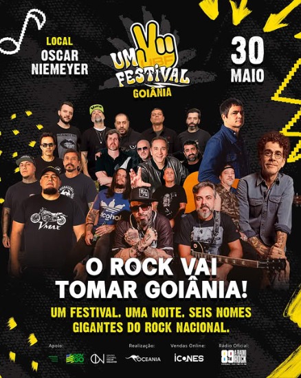 O Centro Cultural Oscar Niemeyer, em Goiânia, recebe o “Um Festival” no próximo dia 30 de maio, sábado. O line-up completo conta com nomes gigantes da música brasileira como: “Samuel Rosa”, “Chico Chico”, “Detonautas”, “CPM 22”, “Raimundos” e a banda “Biquini”, todos celebrando os tempos de ouro do rock nacional. Os últimos ingressos limitados já estão disponíveis no site icones.com.br, variando de R$ 90 (Pista) até R$ 190 (Frontstage Open Bar), nas opções de meia-entrada solidária e casos previstos por Lei. O festival itinerante da Oceania Eventos tem mais informações disponíveis no @vemproum. Tipos de ingresso disponíveis: Meia, Inteira e Solidário (mediante a doação de 1kg de alimento não perecível). Eles já estão à venda no site www.icones.com.br e no Cuba & Café Tabacaria (Av. T-63, 1838 – Nova Suíça – Goiânia / Goiás)