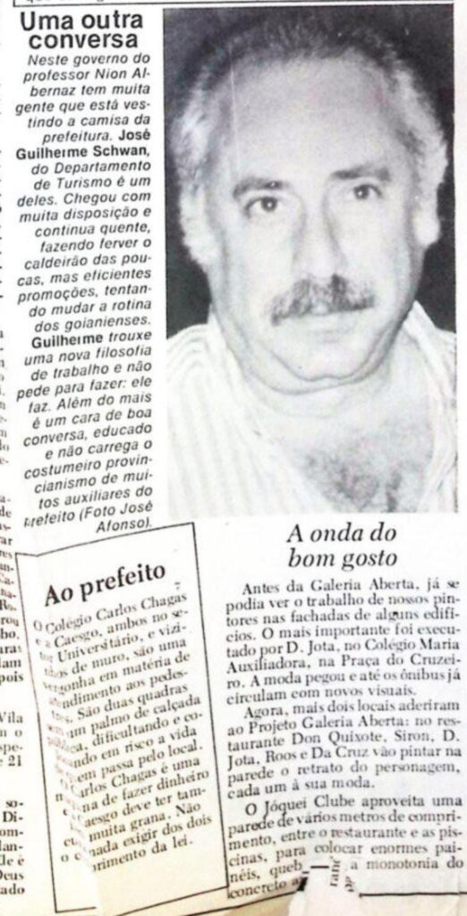 A boa relação com a sociedade goianiense na época o levou a ocupar um cargo inusitado. Era 1989 quando recebeu o convite do prefeito Nion Albernaz e se tornou o primeiro secretário de Turismo de Goiânia. A atuação agradou tanto que voltou a ocupar a mesma função em outro mandato de Nion na prefeitura, entre 1997 e 2001. “Para mim, foi o maior administrador que a capital já teve. Ficou conhecido como o prefeito das florzinhas que embelezavam a cidade. Também deu o start para tornar Goiânia conhecida em todo o Brasil com vários programas sociais desenvolvidos”, afirma.